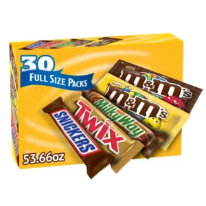 - Contains one (1) 53.66-ounce, 30-count box of full-size, individually wrapped (8) SNICKERS, (7) TWIX, (6) M&M’S Peanut Chocolate Candies, (5) M&M’S Milk Chocolate Candies and (4) MILKY WAY Chocolate Candy Bars